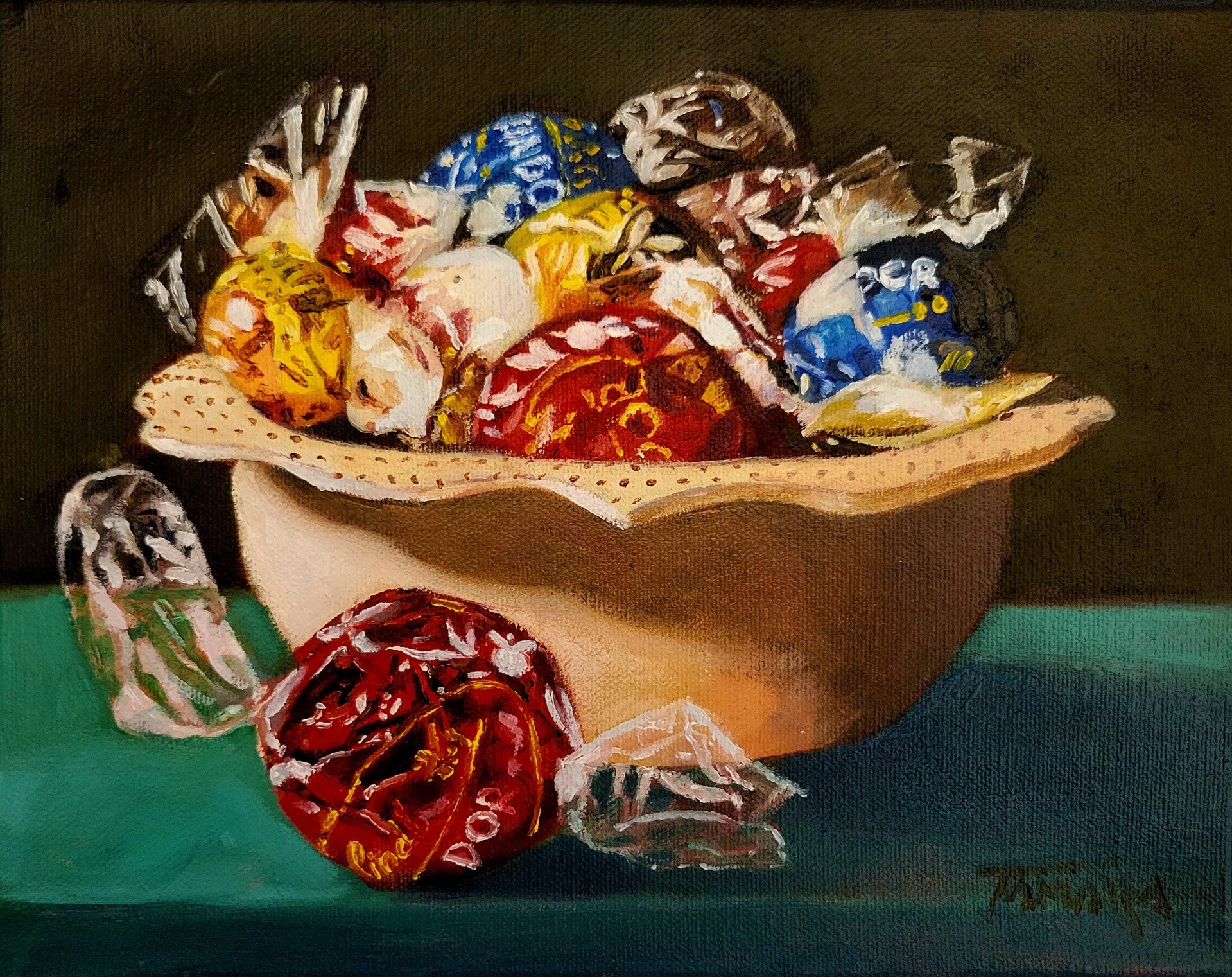 This painting depicts a delicate porcelain bowl with an assortment of wrapped chocolates, set against a moody dark background.The composition showcases a rich interplay of light and shadow, emphasizing the glossy, crinked surfaces of the candy wrappers and hence enhancing the realism while maintaining a painterly quality.