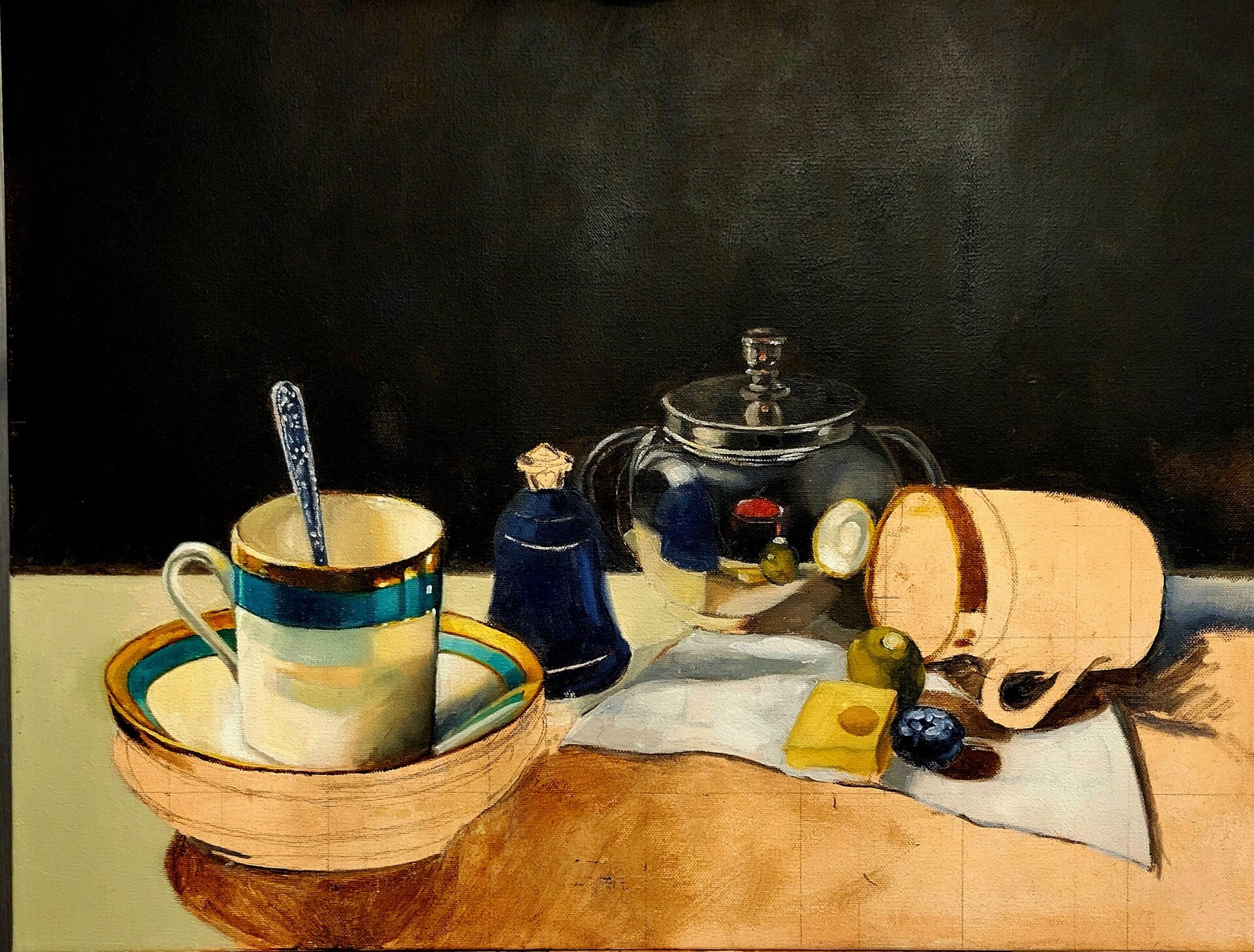 This still-life painting features a carefully arranged composition of elegant porcelain cups, and a bit of cheese and olive that reflect on a silver sugar container, set against a dark bacground.